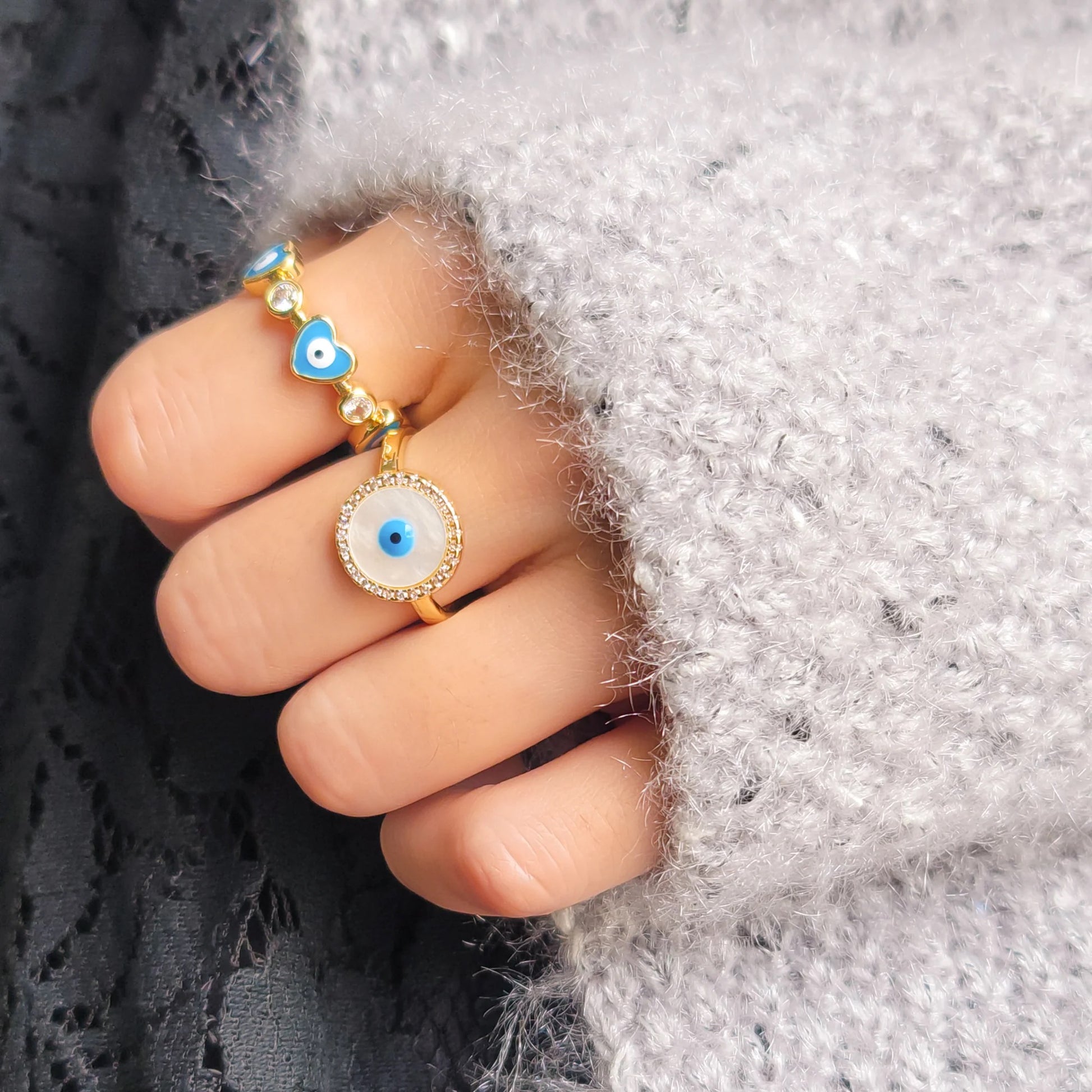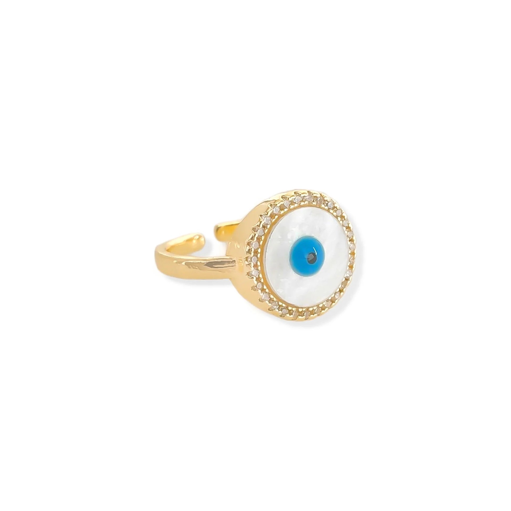 This ring is the ultimate symbol of timeless beauty and elegance. Crafted from shimmering Mother of Pearl, its circular shape is adorned with a sparkling cubic zirconia bezel with a delicate blue enamel eye at the center, creating a look of striking sophistication.