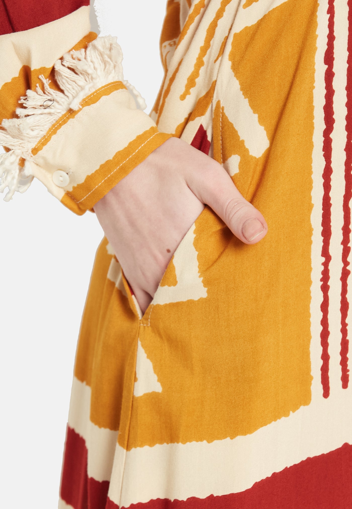 Featuring a one-of-a-kind print that stands out in any setting, the Ember Soleil Shirt Dress is tailored to make a statement. Practicality meets style with its convenient pockets, blending functionality with fashion. The addition of adjustable belts allows for a customizable fit, ensuring both comfort and a flattering silhouette.