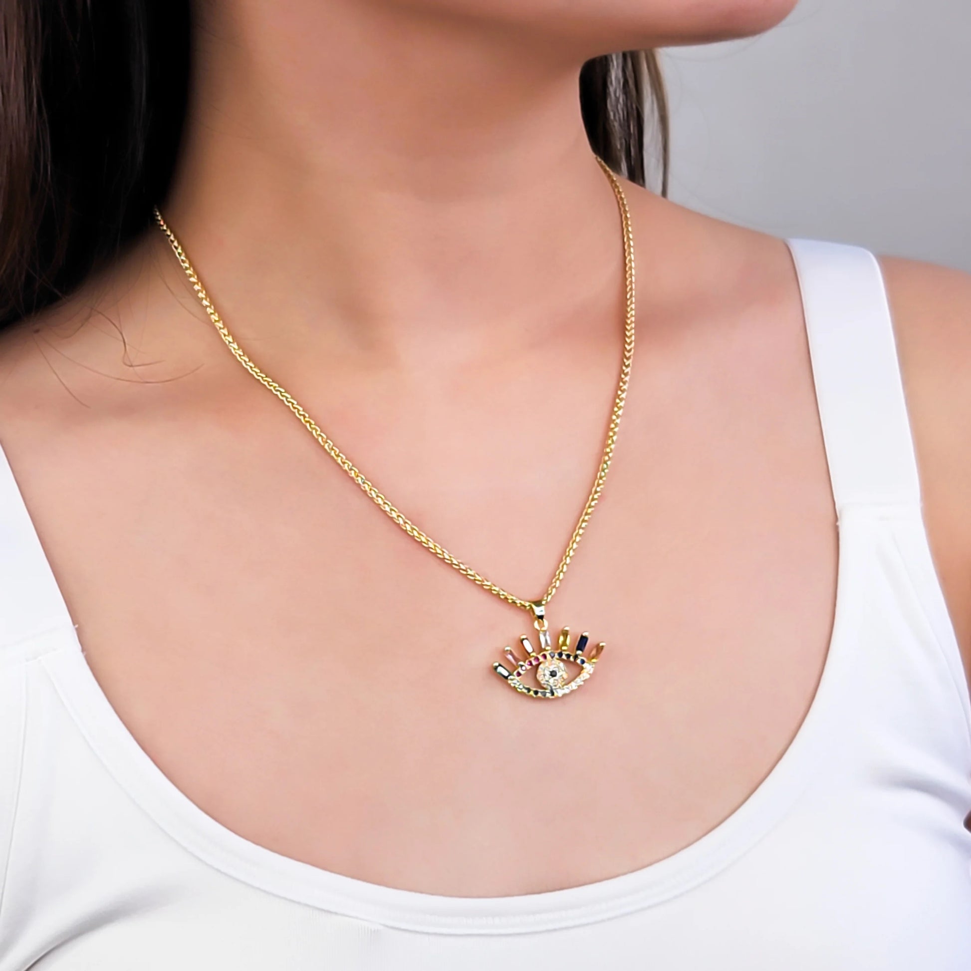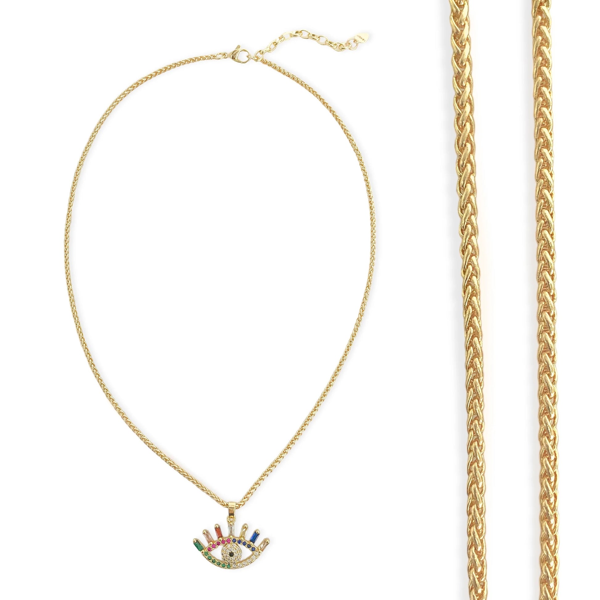 Make a statement with this exquisite gold plated braided chain necklace featuring a multicolor cubic zirconia eye with baguette cut cz lashes. Featuring a unique design that is sure to turn heads, this eye-catching necklace is the perfect addition to any jewelry collection.