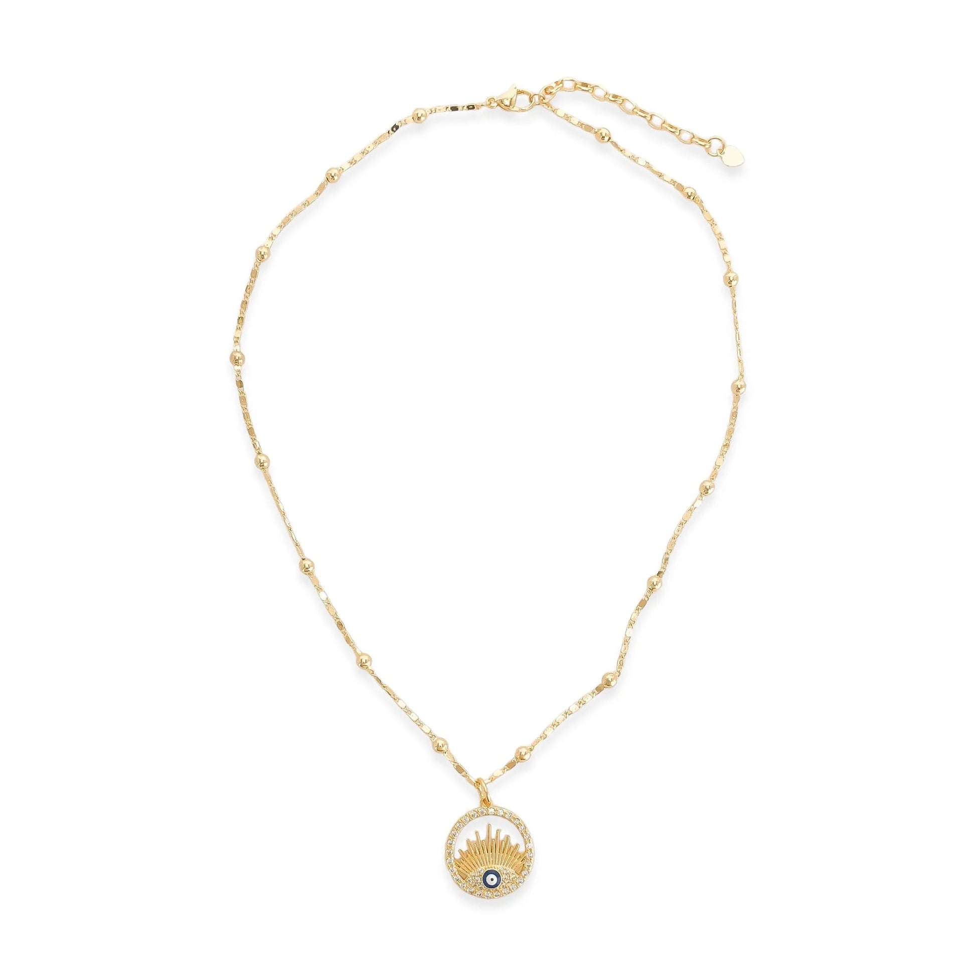 Unleash your inner elegance with this cubic zirconia eye necklace. Featuring a delicate beaded chain and a stunning cubic zirconia eye pendant with a touch of enamel, this necklace is the perfect accessory. Let the mesmerizing eye charm guide you towards effortless style.