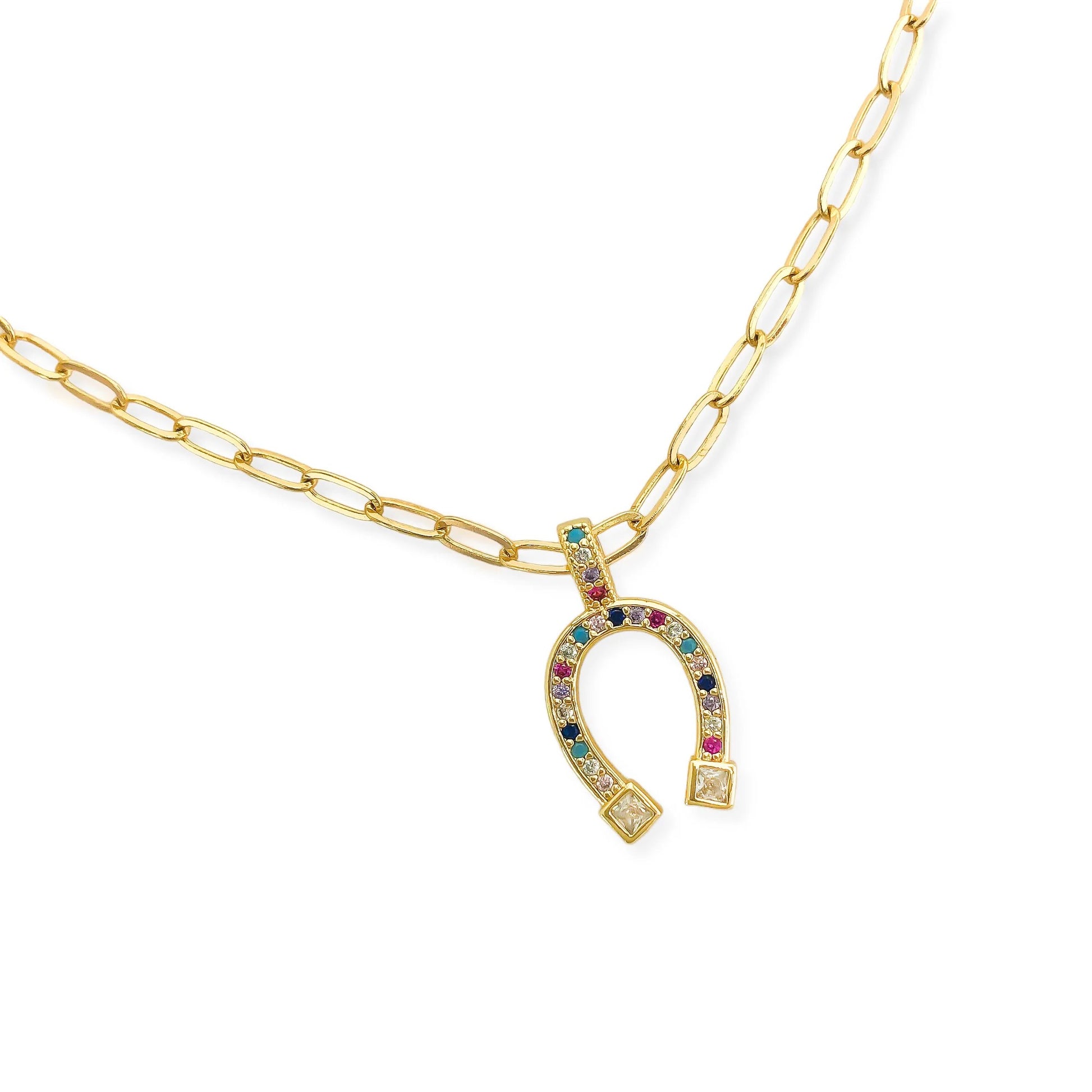 This necklace is a visually stunning piece of jewelry, perfect for any occasion. Crafted with a paperclip chain and glittering multicolor cubic zirconia horseshoe, this necklace brings a touch of luxury to any ensemble.