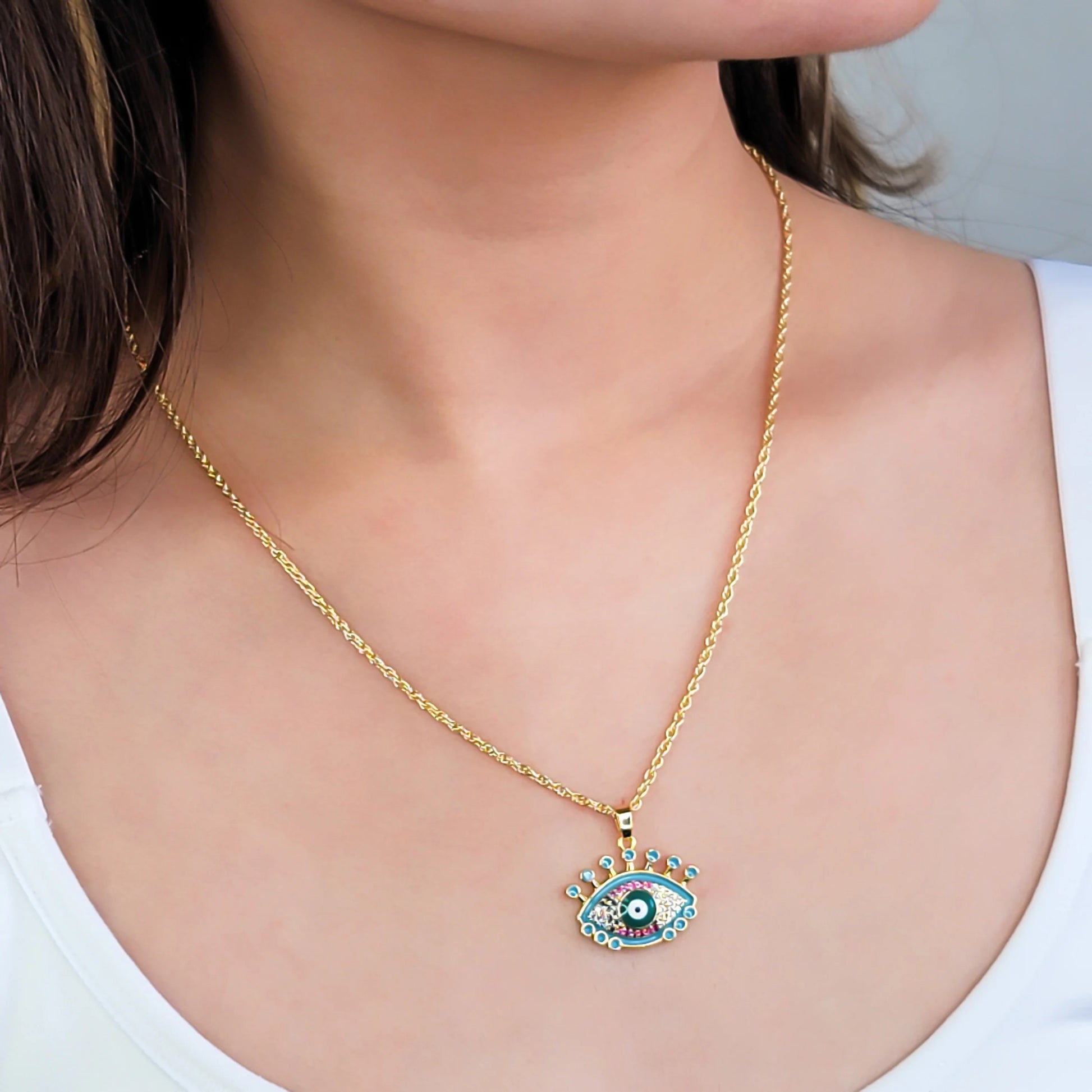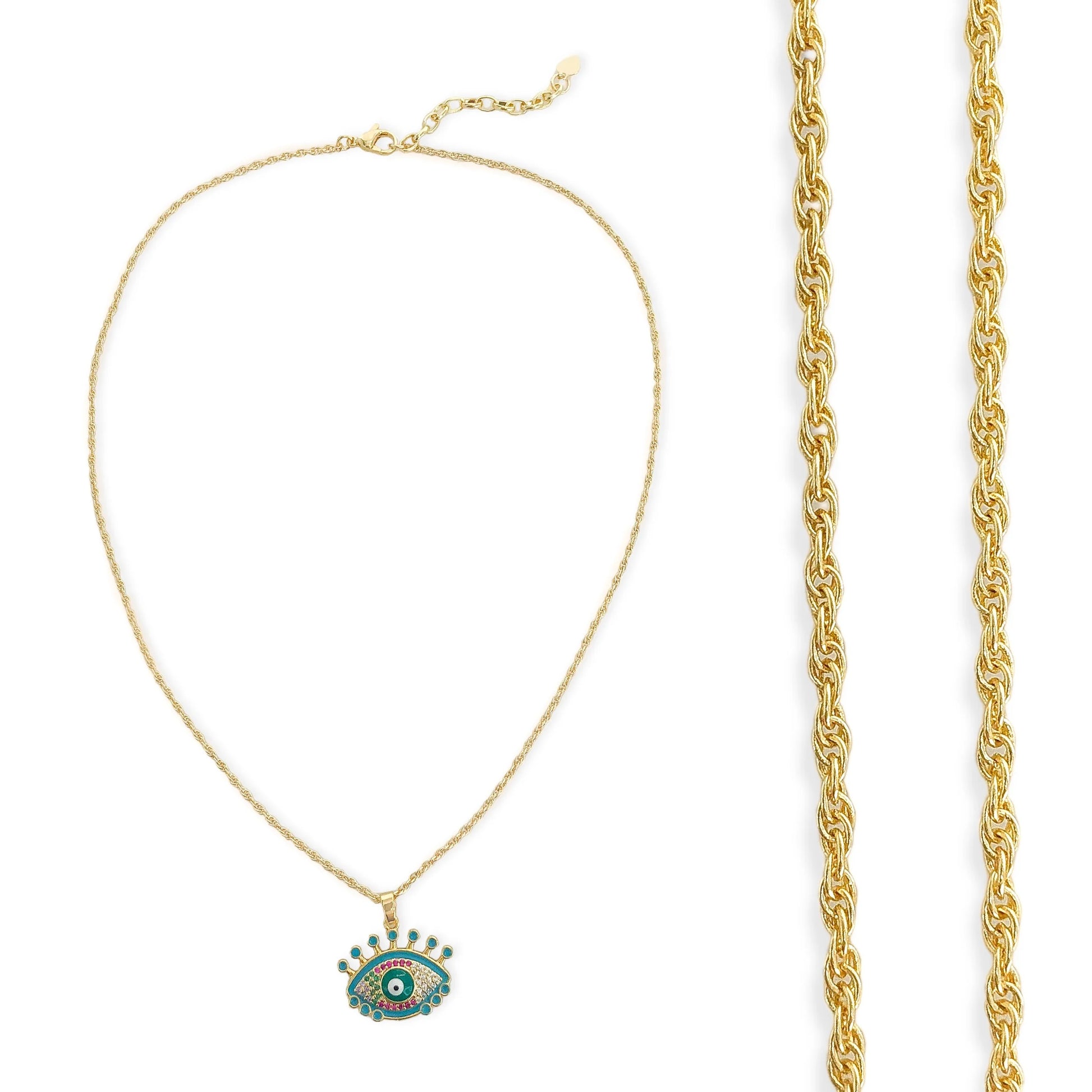 Treat yourself to something special with this dainty rope chain necklace! Featuring an eye charm with enamel detailing, lush lashes, and dazzling multicolor cubic zirconia, this necklace is sure to be the perfect addition to any outfit. This beautiful piece is perfect for any occasion and will add a touch of elegance to your look.